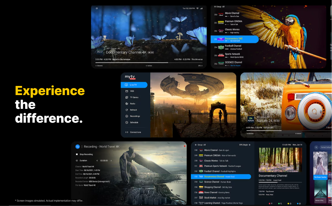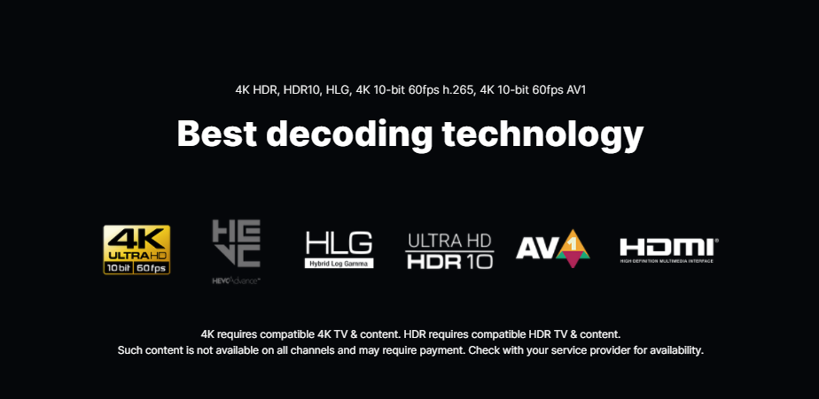 Formuler Z10 Pro Max, comme les précédents boîtiers TV de Formuler, dispose également d’une plate-forme TV de pointe préinstallée appelée MYTVOnline2. L’application vous permet de regarder du contenu IPTV, prend en charge l’image dans l’image (PiP), l’enregistrement vidéo numérique intelligent, la vidéo à la demande, l’enregistrement PVR avancé et le décalage temporel. En outre, le décodage AV1 4K 10 bits 60 ips, le Z10 Pro Max prend en charge 4K HDR, HDR10, HLG et 4K 10 bits 60 ips H.265. L’appareil prend également en charge les mises à jour Widevine L1, L3 DRM et OTA.