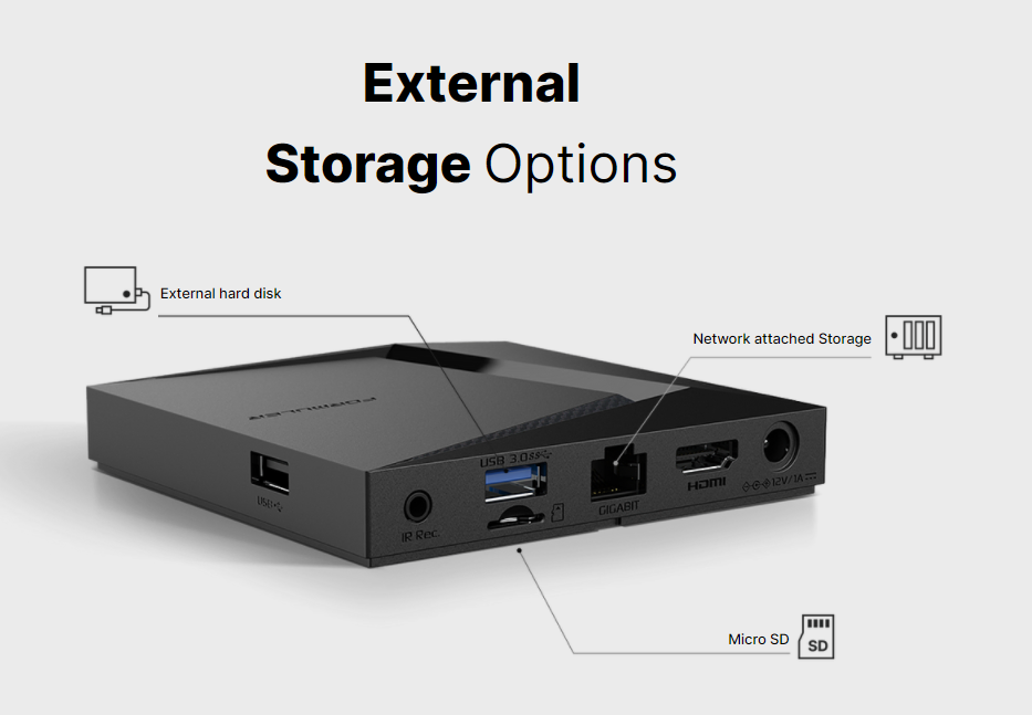 À l’intérieur, nous trouvons 4 Go de RAM DDR4 à 2400 MHz et 32 Go de stockage eMMC. De plus, le streamer multimédia peut être étendu avec un stockage supplémentaire via USB, RJ45 (client de stockage connecté au réseau) et une carte Micro SD.